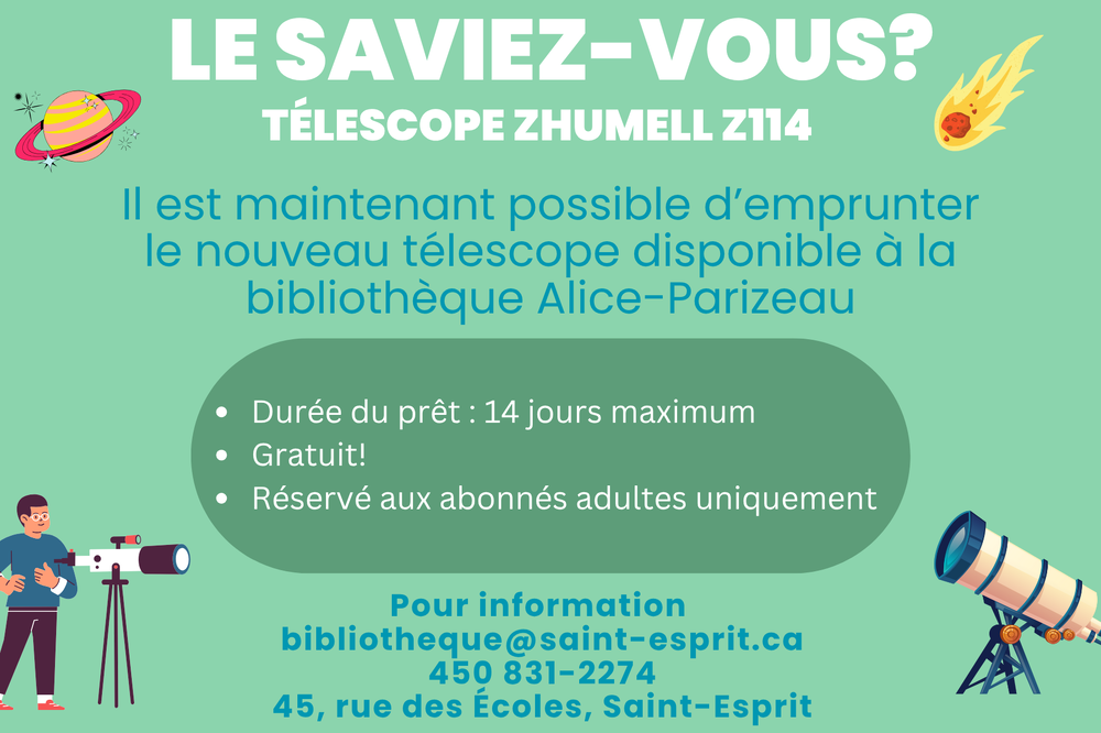 Publié le 15 octobre 2025 Il est maintenant possible d'emprunter le nouveau télescope Zhumell Z114 à la bibliothèque Alice-Parizeau